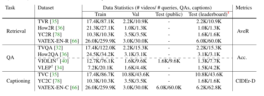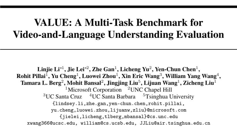 目前视频和语言的理解任务大多是在不同的数据集上进行评估的,很难衡量一个视频语言模型的综合性能。为此,作者提出了一个 VALUE 基准,这个基准包括了 11 个视频语言数据集,涵盖不同的视频类型、视频长度和数据量。