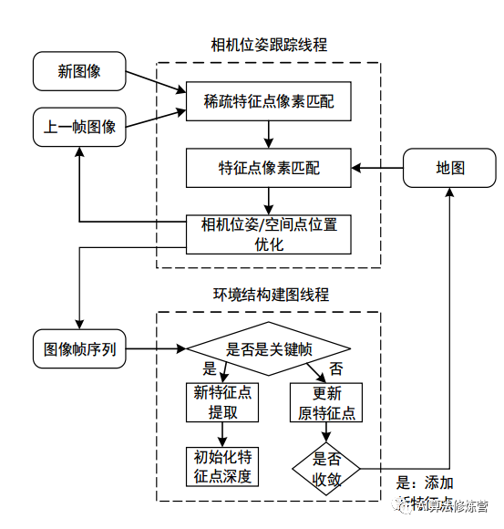 SVO 面向无人机航拍场合,将特征点法与直接法结合,跟踪关键点,不计算描述子,根据关键点周围的小图像块的信息估计相机的运动。主要分运动估计线程和地图构建线程两个线程。
