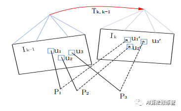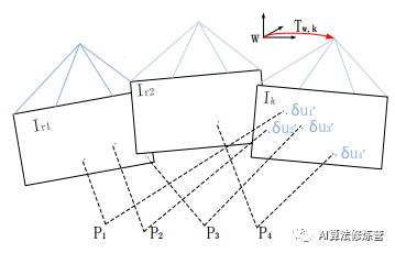 3)位姿结构优化。 如图所示,像素位置优化后,利用建立的对应关系对空间三维点和相机位置进行分别优化,构 建 像 素 重 投 影 误 差 的 优 化 函 数
