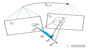 2)特征对齐。如图,由于深度估计和相机位姿的不准导致预测的特征块位置不准,通过光流跟踪对特征点位置进行优化,具体为:对每个当前帧能观察到的地图点 p(深度已收敛),找到观察 p 角度最小的关键帧 r 上的对应点 ui,得到 p 在当前帧上的投影。优化的目标函数是特征块(8*8的 patch ) 及 其 在 仿 射 变 换 下 的 灰 度 差