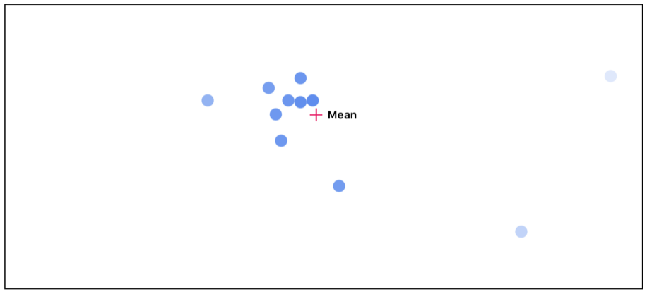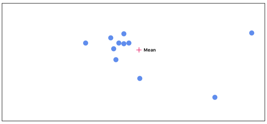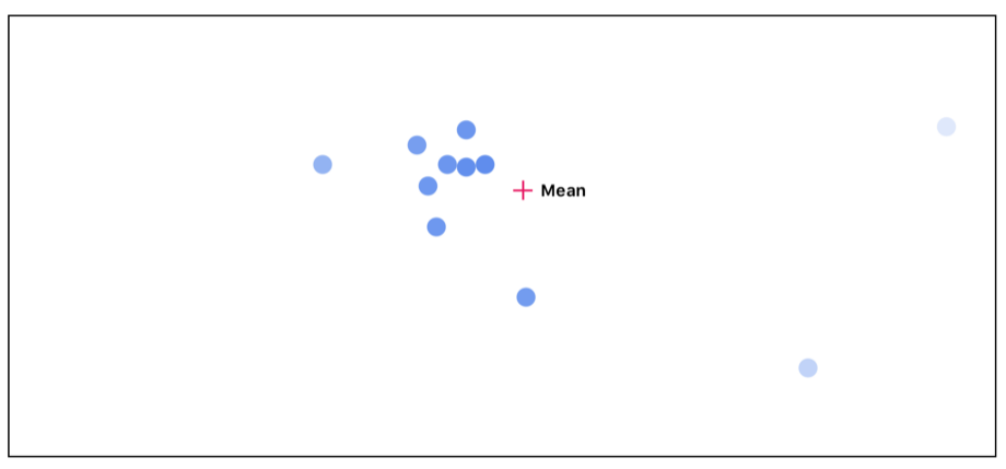 接下来我们可以测量每个点和平均值点之间的距离。距离越远的点,其重要程度就越低。