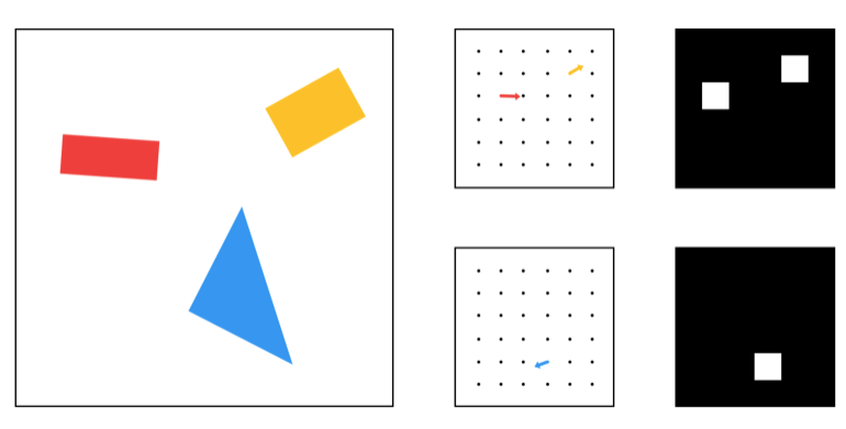 如下是两个胶囊层(一个用来处理长方形一个用来处理三角形)和 2 个传统像素输出的一个简化版对比: