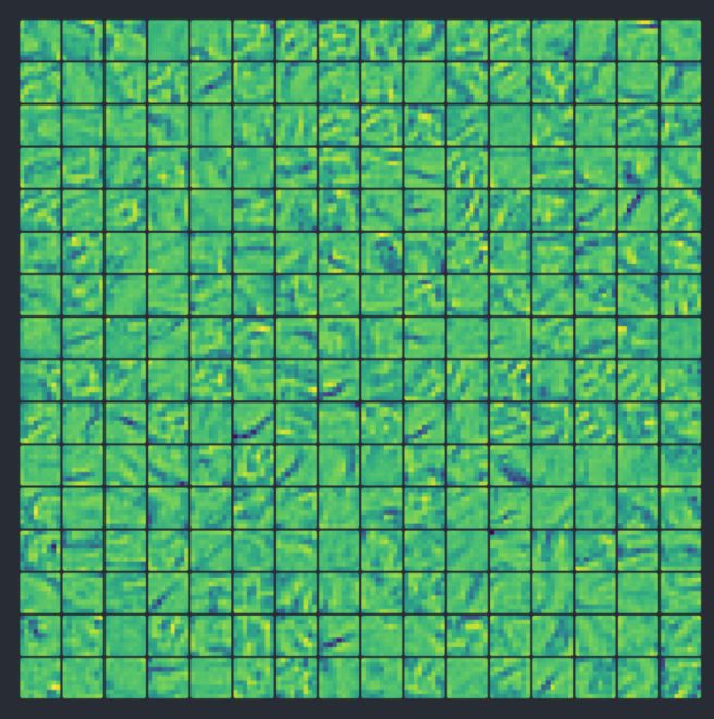 如下所示是经过训练后最终得到的 256 个卷积核(为了方便理解我给他们上了色)。我们用蓝色来表示负数, 用 0 来表示绿色,用黄色来表示正数. 并且颜色越强,其绝对值越大。