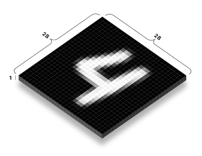 每个像素都被表示为 0 到 255 之间的一个数字并且被存储在一个 28x28x1 的矩阵 [28, 28, 1] 里。每一个像素的颜色越明亮,其数值越大。