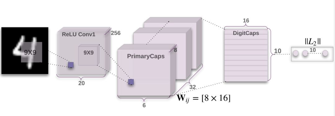 如下所示是 CapsNet 的结构。如果您现在还不理解每个部分的具体含义,不必担心。我会尽我所能一层一层地进行详细讨论。