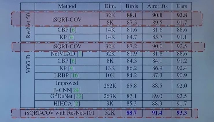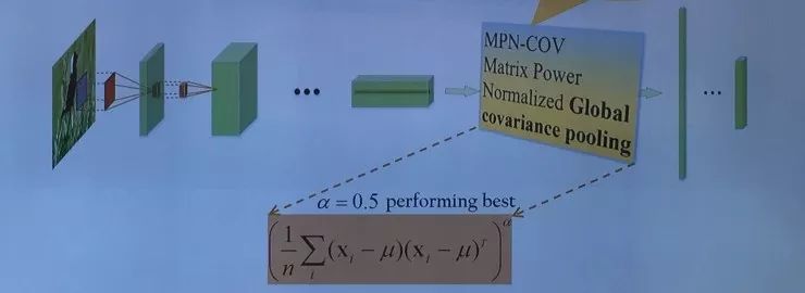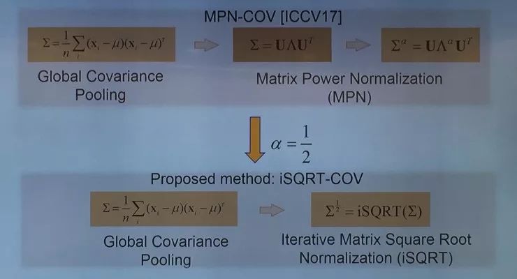 基本的方法很简单,即将一阶的均值换成二阶的协方差。不过这里协方差有一个幂,经验证该幂值取 0.5 时的性能最优,它解决了两个问题:解决了小样本高维度难以统计的问题;有效地利用了协方差矩阵(是一个李群)的几何结构。这方面的理论工作发表在 CVPR 2016 中。