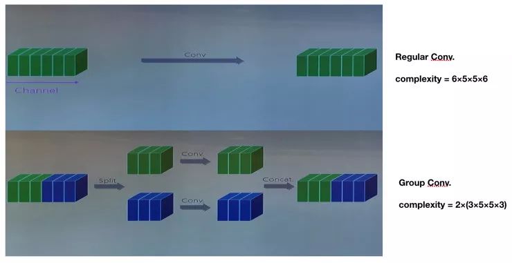 考虑一个传统的卷积,给定输入和输出通道都为 6 个,kernel 为 5×5,那么其 complexity 将为 6×5×5×6。而对于一个分为两组的组卷积,每组有 3 个通道,分别对两组单独做卷积运算,其 complexity 将为 2×(3×5×5×3)。可以看出这样的好处是复杂度降低。