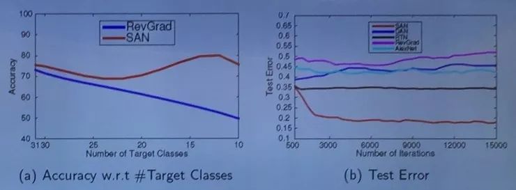 在这一个分析图中,可以看出在 source domain 一定的情况下,target domain 中的类数量越少,选择对抗网络的表现越好,而作为对比基于对抗网络的深度迁移模型 RevGrad 则会随着 target domain 的类数量减少性能逐渐下降。而另一方面,SAN 的误差相比其他模型也要低得多,且在迭代中更快地达到稳定。