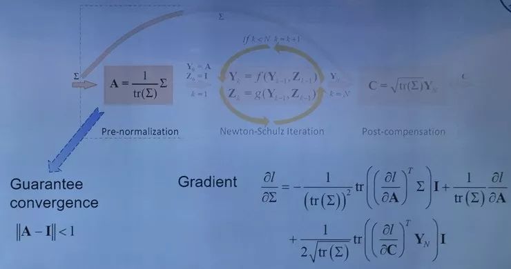 共有三层,分别为 pre-normalization、Newton-Schulz Iteration、Post-compensation。之所以出现 pre-normalization,是因为迭代本身并不是全局收敛,通过协方差矩阵除以矩阵的迹可以保证其收敛性;但是除以迹后改变了协方差的大小,因此在迭代之后通过 Post-compensation 再将迹的值给补偿回来。这两层非常关键,没有这两层迭代根本不会收敛。