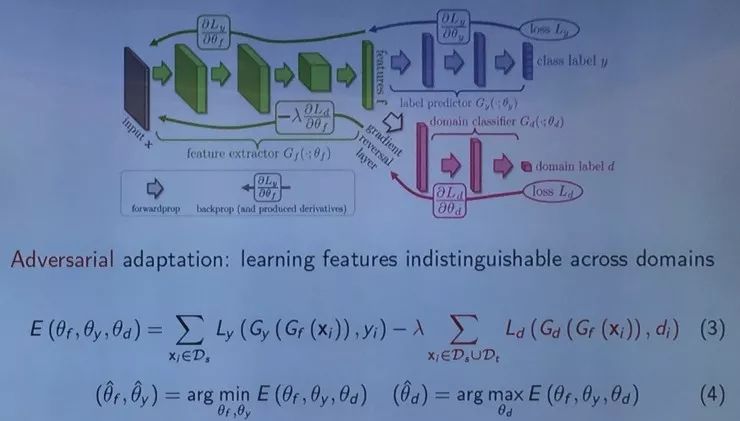 在 source domain 和 target domain 之间学习一个判别器,如果这个判别器不能将两个 domain 的特征/分布分开,那么这就是一个可以做迁移学习的特征。对应的工作是 Goodfellow et al. 在 NIPS 2014 上的工作[3]。