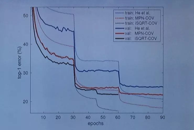 在 ResNet-50 的架构下,iSQRT-COV 网络在不到 50 次迭代下就能得到很好的结果,而其他方法则需要至少 60 次迭代;而性能上没有损失,甚至还有少许提升。