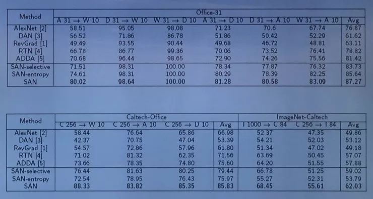 他们也将结果进行了可视化。可以看出 SAN 能够将不同的类清晰地区分开来,source domain 和 target domain 中相似的类别能够有效地聚在一起;作为对比,其他方法中两个 domain 中的类则全部/部分地混杂在一起。