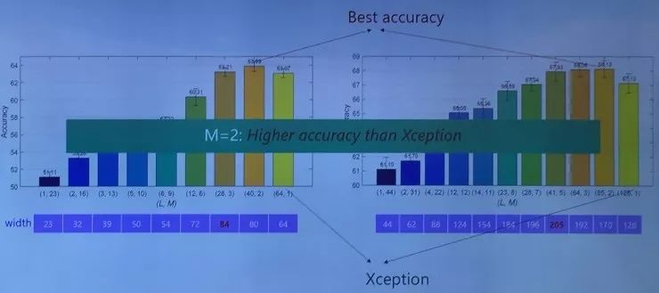 张婷随后提到,谷歌的 Xception 事实上可以看做是交错组卷积的一个极端情况,即第一次组卷积中每组只有一个通道,第二次组卷积为 3×3 的卷积。一个立刻想到的问题就是:在怎样的组卷积分配模式下才能够得到最佳的结果呢?张婷团队针对这个问题也进行了相关的实验,结果发现在第一次组卷积中每组分配两个通道的情况会得到最佳的精度。