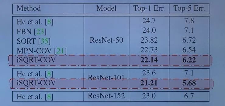 基于这样的思考,李培华团队考虑用一个二阶(甚至高阶)的统计方法来替换一阶的全局平均池化,并由此而做出一系列工作,分别发表在 CVPR 2016[1](数学理论的推导和验证)、ICCV 2017 [2](首次在大规模图像识别中使用,性能优异)和 CVPR 2018(迭代计算矩阵平方根,速率得到提升)上。