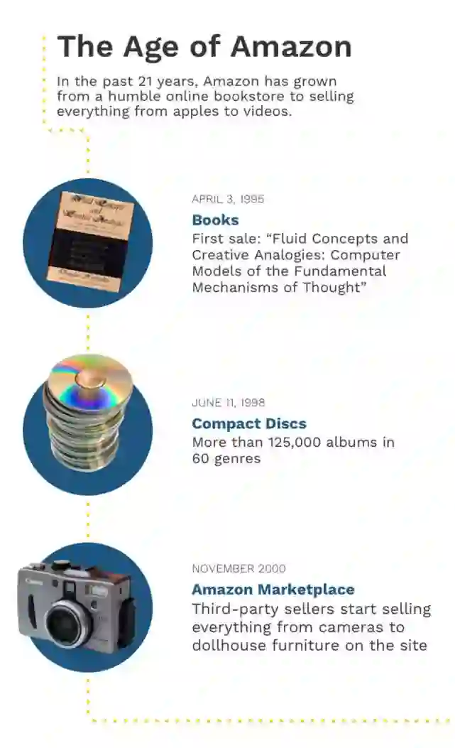 在过去的21年,亚马逊从一家小型在线书店发展成为销售几乎所有物品的大公司,包括水果和食品。