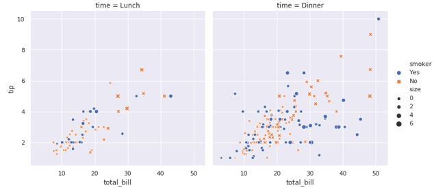import seaborn as snssns.set()tips =sns.load_dataset("tips")sns.relplot(x="total_bill",y="tip", col="time", hue="smoker",style="smoker", size="size", data=tips);