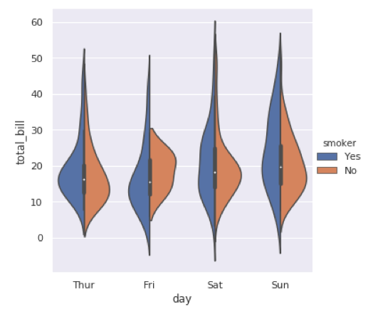 import seaborn as snssns.catplot(x="day",y="total_bill", hue="smoker", kind="violin",split=True, data=tips);