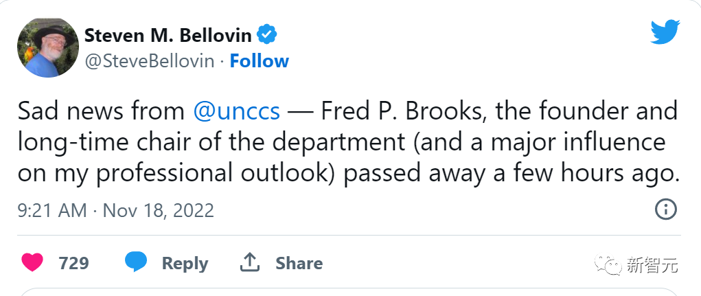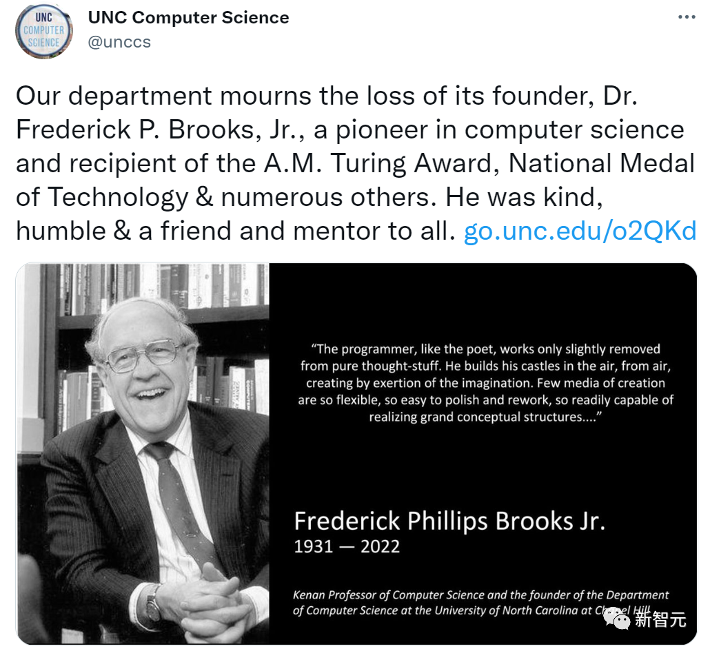 Brooks生前亲自创办、并长期担任领导工作的北卡罗来纳大学教堂山分校计算机科学系在Twitter官方账号上发布讣告,悼念这位对计算机发展做出卓越贡献的先驱。