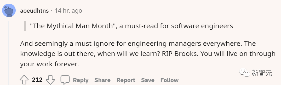 难怪在Reddit上,有人称《人月神话》是所有软件工程师的必读书目后,网友回复道:「看上去这本『必读书目』也是『必忘书目』。Brooks提到的经验教训,我们什么时候才能真正学到呢?」
