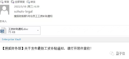 在一份群聊记录截图中显示,5月18日,搜狐全体员工收到了一封来自“搜狐财务部”的邮件,来源显示为搜狐公司内部域名。