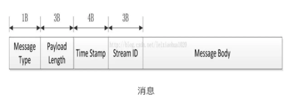 消息首部(Message Header)有四部分组成:标志消息类型的Message Type ID,标志消息长度的Payload Length,标识时间戳的Timestamp,标识消息所属媒体流的Stream ID