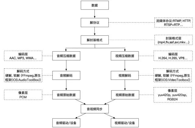 因为接收端拿到编码的视频流最终还是想将视频渲染到屏幕上, 将音频通过扬声器等输出设备播出,所以接着上面的步骤,接收端可以通过RTMP协议拿到视频流数据,然后需要利用FFmpeg parse数据,因为我们需要将数据中的音频跟视频分开,分离出音视频数据后需要分别对它们做解码操作.解码的视频即为YUV/RGB等格式,解码后的音频即为线性PCM数据.