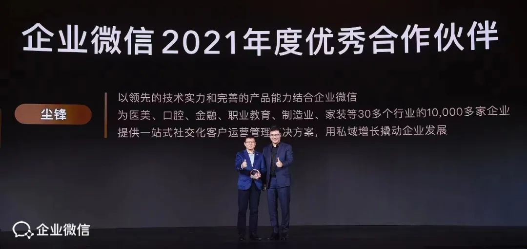 聊到尘锋的发展,就不得不提到企业微信。企业微信几乎可以说是SCRM行业的“基础设施”,直接推动了SCRM行业的发展和繁荣。企业微信作为私域流量沉淀池以及与个人微信数据打通,使其成为了SCRM的天然阵地。“企业微信正式对外开放,尘锋作为首批All in企业微信的SCRM厂商开始从微信中迁移过来,在与企业微信的生态融合中取得了巨大发展。”短短两年多的时间里尘锋已经累计服务30多个行业的10,000多家企业,得到行业以及企业微信官方的高度认可,也是业内唯一一家获得“企业微信2021年度优秀合作伙伴”的SCRM服务商。
