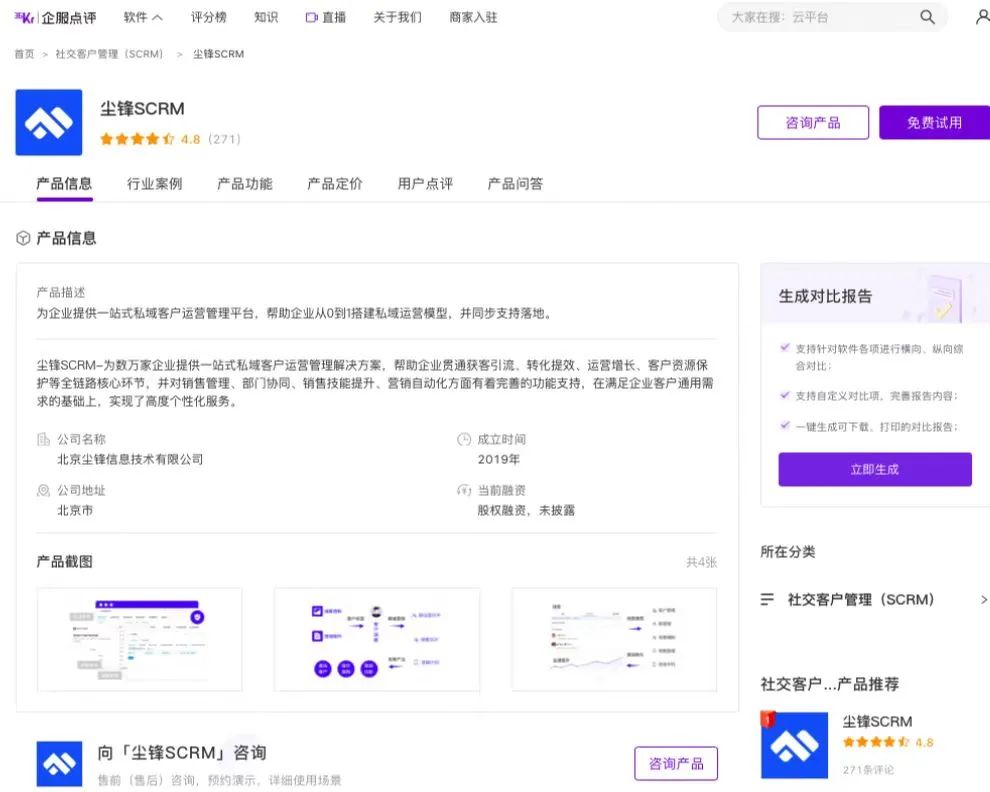 * 尘锋SCRM在36氪企服点评产品页面
