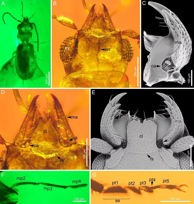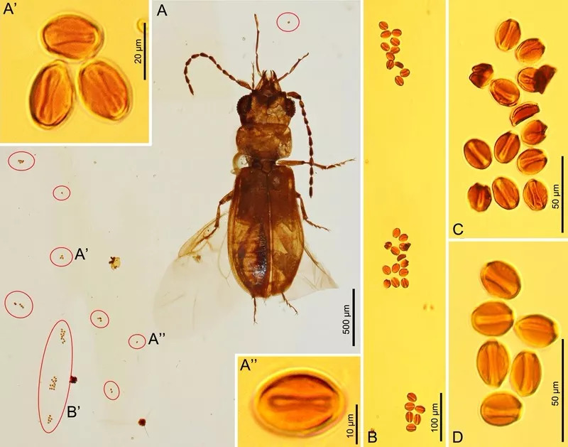 近日,中国科学院南京地质古生物研究所研究团队通过对缅甸琥珀中大量的甲虫化石进行系统研究,发现了一类独特的扁甲类昆虫和它所取食的聚集成簇的苏铁花粉。综合对比现代不同大陆上这类甲虫与铁树的传粉关系,证明了甲虫与苏铁之间传粉关系的建立不晚于侏罗纪早期,远早于被子植物及其传粉者的起源和兴盛。该研究于8月16日在线发表于《当代生物学》(Current Biology)上。