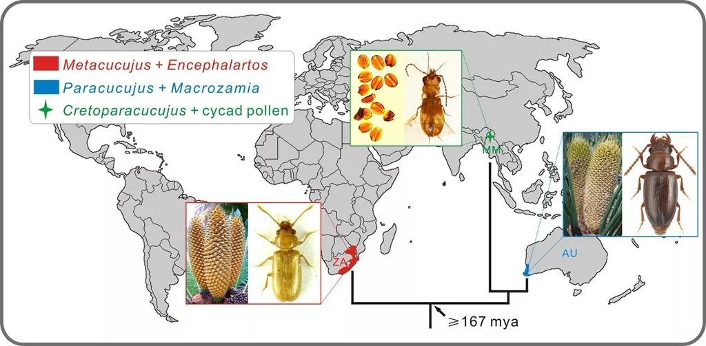 研究人员在白垩纪中期缅甸琥珀(约1亿年前)中发现的一枚保存完好的澳洲蕈甲科昆虫,代表一个新属种,即喜苏铁白垩似扁甲(Cretoparacucujus cycadophilus Cai and Escalona, 2018)。这类甲虫体长约2mm,口器特征非常特化,下颚须很长,上颚基部具有带毛小窝,这些形态特征与现生取食花粉的甲虫(如澳洲蕈甲、某些露尾甲等)十分相似。基于现生澳洲蕈甲的所有已知属和化石属的支序系统学分析(最大简约法和贝叶斯法)证明,白垩似扁甲属与现代的似扁甲属(Paracucujus)构成姊妹群的关系。现生的似扁甲只分布在澳大利亚西南部,专门取食一类泽米科苏铁(Macrozamia riedlei)的花粉,并协助其传粉。更为有趣的是,远在非洲大陆(南非的东南部)同样存在着与之极其类似的传粉关系,即Metacucujus属的澳洲蕈甲作为非洲苏铁属(Encephalartos)的主要传粉者。而这两个大陆上的甲虫与铁树两两之间的关系都非常紧密,在系统位置上都分别属于同一个族。因此,根据现代南半球两个大陆上发现的澳洲蕈甲与苏铁的传粉关系,可以推测这种甲虫为铁树传粉的关系起源可能很早,早于冈瓦纳大陆彻底裂解之前,即1.67亿年之前。白垩纪中期缅甸琥珀中发现现生似扁甲属的近亲,验证了澳洲蕈甲与某些苏铁的传粉关系早已建立并孑遗至今的假说。