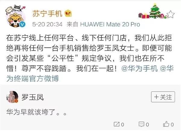 随后,苏宁手机转发了罗玉凤这条微博并表示,在苏宁线上任何平台、线下任何门店,我们从此拒绝再将任何一台手机销售给罗玉凤女士。即便可能会引发某些“公平性”规定争议,我们也在所不惜。尊严不容践踏,我们在一起!苏宁手机官微同时@华为手机和华为终端官方微博。