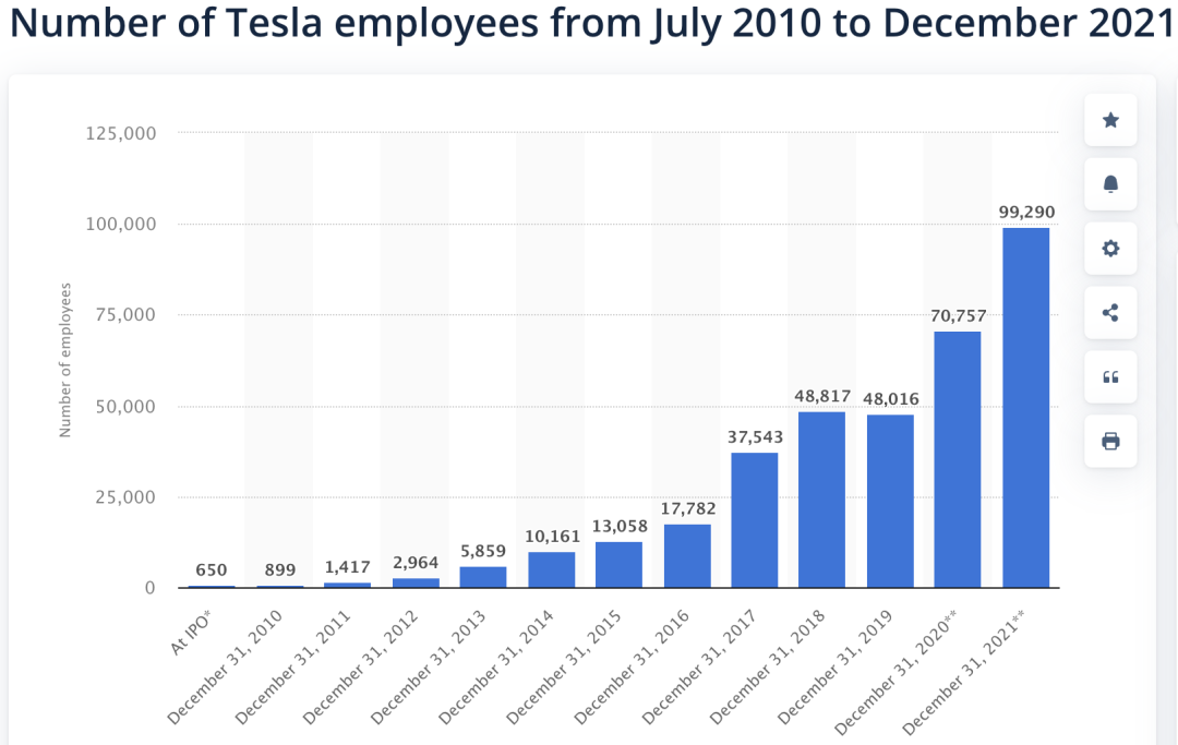 而近年来,特斯拉员工规模一直处于扩张状态,2020年底就达到了7万多人。