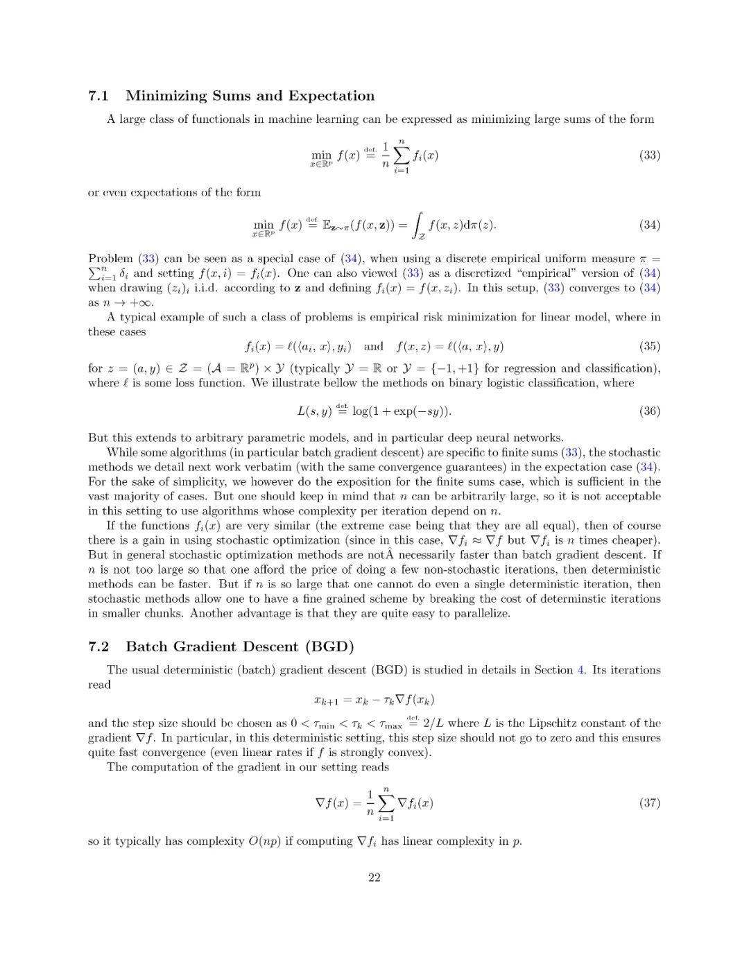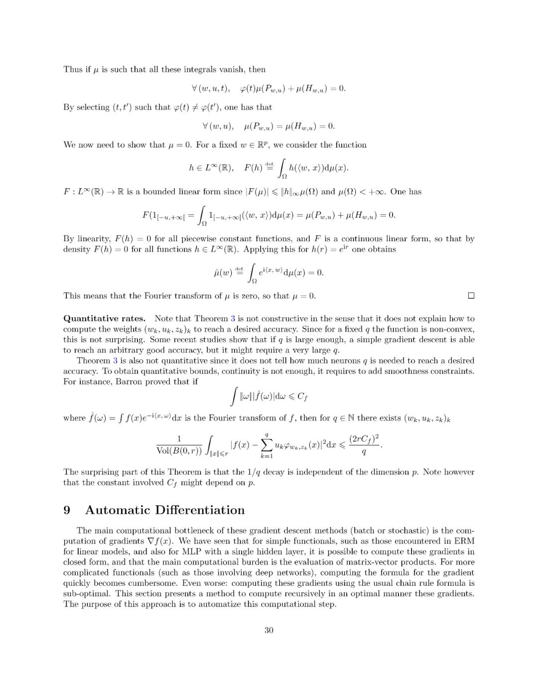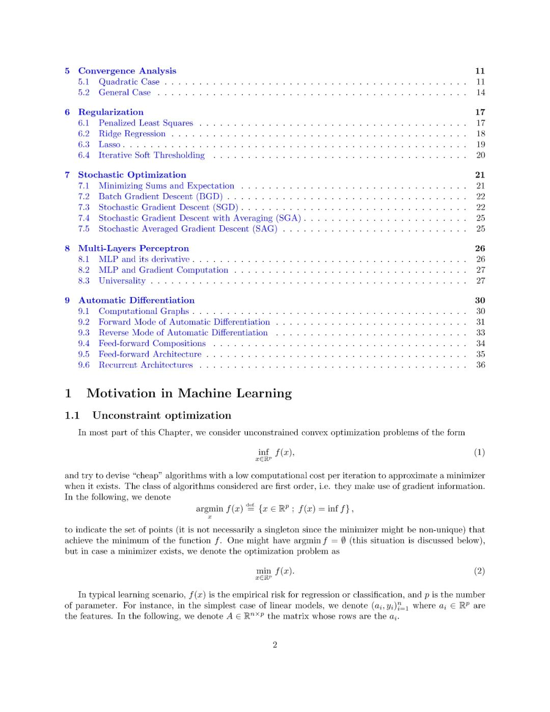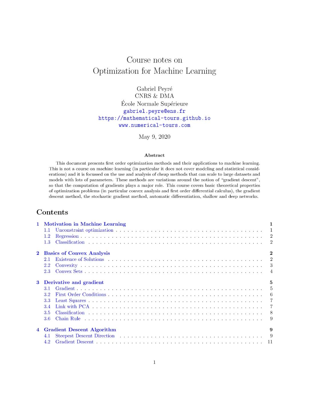 本文介绍了一阶优化方法及其在机器学习中的应用。这不是一门关于机器学习的课程(特别是它不涉及建模和统计方面的考虑),它侧重于使用和分析可以扩展到具有大量参数的大型数据集和模型的廉价方法。这些方法都是围绕“梯度下降”的概念而变化的,因此梯度的计算起着主要的作用。本课程包括最优化问题的基本理论性质(特别是凸分析和一阶微分学)、梯度下降法、随机梯度法、自动微分、浅层和深层网络。