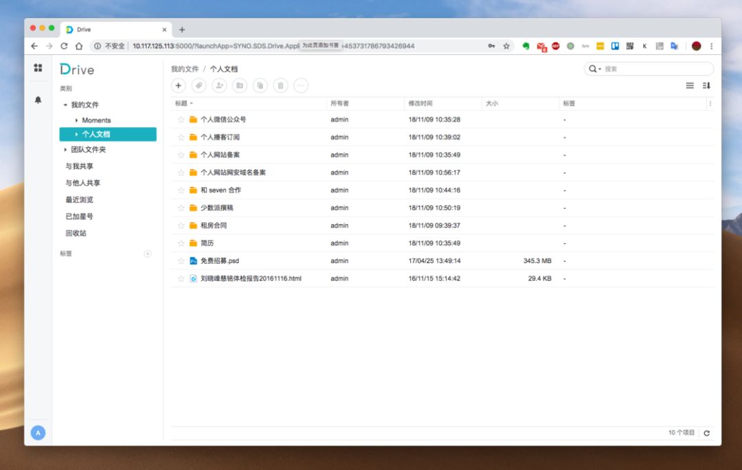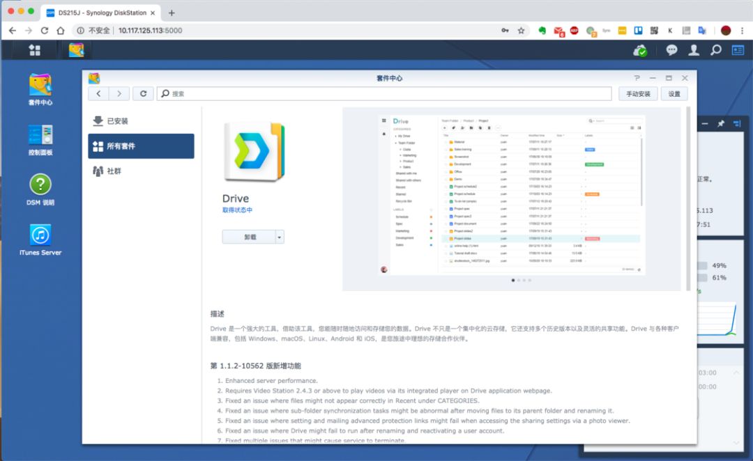 首先在群晖的应用商店中找到 Drive 并安装,如果你是管理员的话使用管理员就可以登录到 Drive 的 web 端页面中了,用过例如百度网盘等工具的话你一定明白在web 可以上传文档,移动到其他文件夹等等。如果牵涉需要直接在 web 端编辑,则可以通过安装群晖 Office 组件,你可以理解成类似 微软的 Office online 这样的在线编辑器。