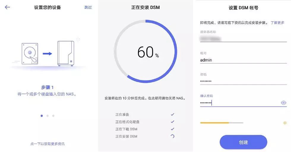确保手机和群晖当前处于同一个内网网段(如果在家里使用的话一般都处于同一个网段),然后手机下载群晖管家,打开之后先注册一个群晖(Synology)账号,然后等待局域网发现新的群晖,找到新的 NAS 设备后会直接安装 DSM 系统,接着等待十分钟左右等待系统安装完成,之后再设定你的 NAS 的超级用户登录账户以及密码,最后设置 QuickConnect 方便你未来通过外网来随时登录你放在家中的 NAS。