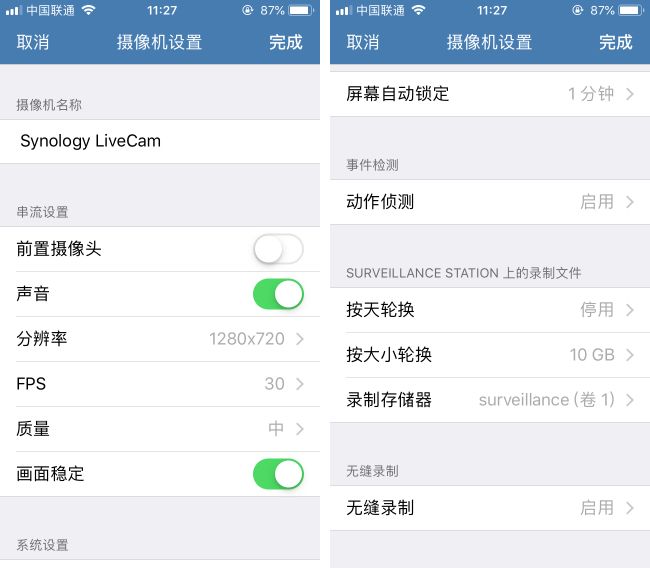 当然你可以对监控用的手机进行一番设置,通过进阶设置你可以对录像质量进行进一步的设置(分辨率、帧数、质量以及使用的摄像头等),同时你还可以设置报警规则(动作监控报警)并且自定义录像在 NAS 上的保留天数以及是否无缝录制——即便是遇到断网,也可以先将录制视频保存在手机上,然后在有网络的情况下上传到 NAS 上。