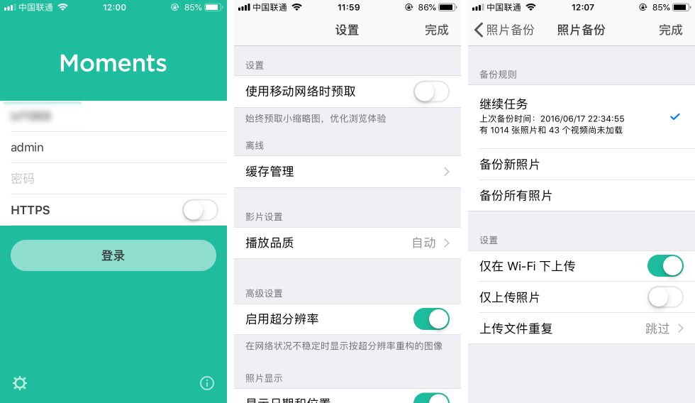 Moments 就是群晖推出的手机端云相册服务,换言之你可以认为是基于本地群晖私有云的「iCloud 相册」,和 iCloud 类似,Moments 的同步也无需你过多的干预,初次设置使用你的 QuickConnect ID 以及用户密码登录之后,选择同步策略就可以进行远程备份了,在同步备份策略中你可以选择备份仅限 Wi-Fi 传输,是否仅上传照片以及释放本地空间等等,同时也可以看到对应的备份进度。