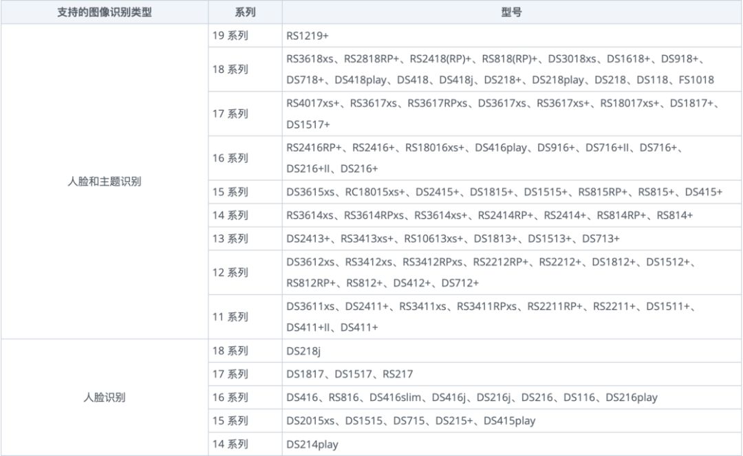 这里要提醒大家一下,Moments 在不同的 NAS 机型上对于智能识别的类型不尽相同,部分机型仅支持人脸识别,也就是仅能对人像进行分类,而其他部分机型则可以识别更多物体,对照片实现更细致的分类。大家可以根据下面的图表来对照各机型的支持情况。