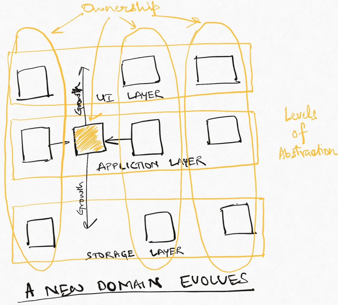上面的例子表明,如果团队最初拥有其工作中的所有抽象级别(也就是全栈团队),那么新的团队和领域可以从每个团队的工作中派生出来,这些团队和领域可以在相同的抽象级别上产生。从某种意义上说,新领域是一个全新的可重用组件。我们通过对组件进行分层来垂直扩展组织,并且这些层是在彼此之上创建可重用组件的。我们还通过添加需要解决的全新问题空间来水平扩展组织,而每一个问题空间反过来又会带来新的深化机会。