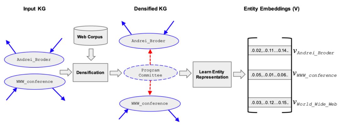 具体来讲,论文中将维基百科中高频出现的 unigram 和 bi-gram 短语当做伪实体,然后利用其它 web 文本中的共现信息建立伪实体和其他实体间的边。整体过程如下图所示: