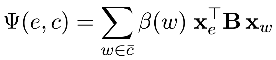 Entity 的向量表示和 word 的向量表示属于同一个语义空间,是在基于 word2vec得到的 word embedding 的基础上 bootstrap 得到的。一个 entity 的向量会和高频共现的 word 更接近,具体的计算过程如下所示: