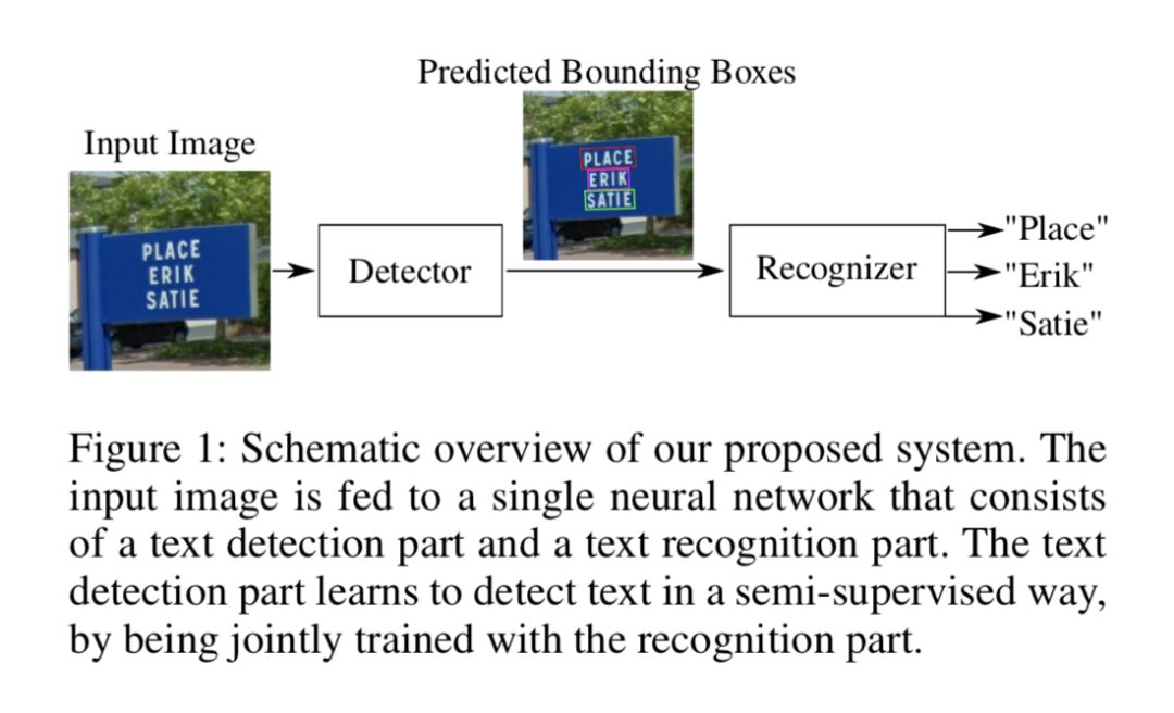 本文设计了一个端到端的半监督文本检测和识别模型,通过在 SVNH 和 FSNS 数据集上验证了该模型的 work。文章的模型不需要提供文本检测的 bounding box 只需要提供正确的 label,然后通过预测误差反向传播修正文本检测结果。