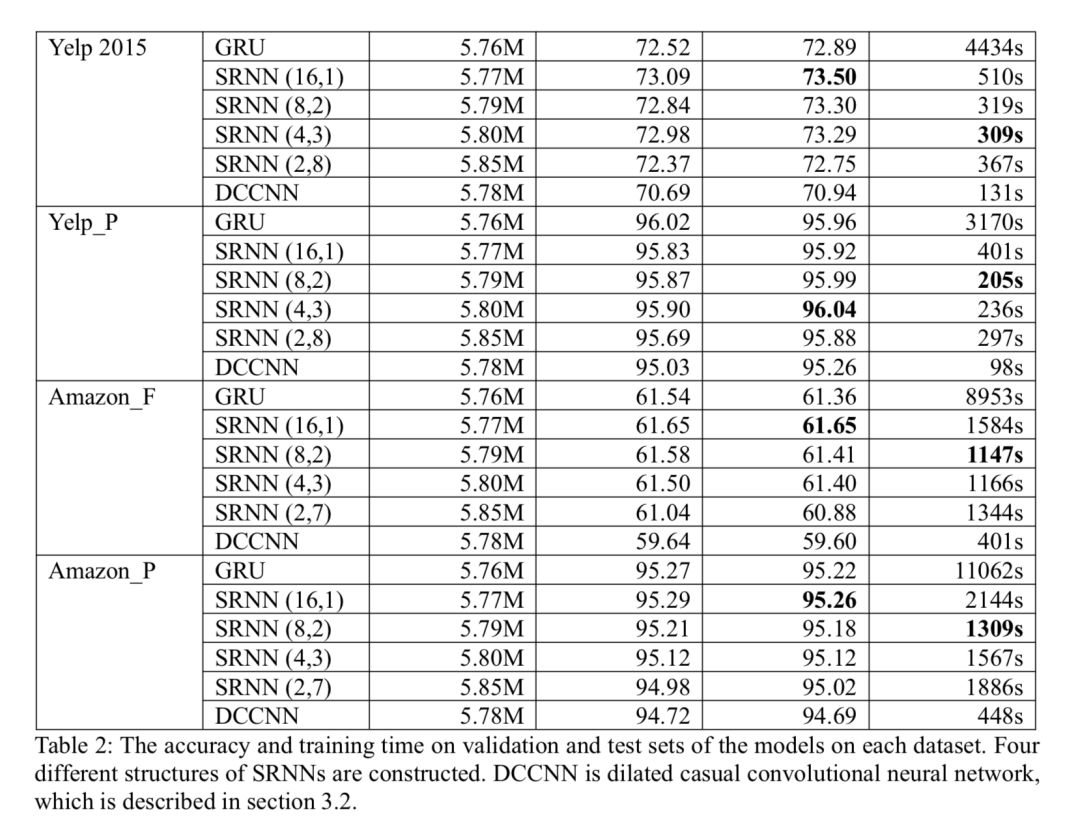 SRNN 把 RNN 序列分成每份 K 份,这样每份可以各自运行(并行),得到长度为 N 的新序列,后续可以新序列上继续如上操作,一直到序列长度等于 1 或满足需求。通过在 6 个较大规模的情感分类数据集上测试,相比于 RNN,SRNN 都取得很大的性能优势。