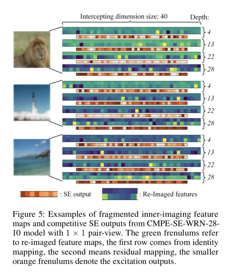 另外,本文针对网络中间特征的精炼建模任务,提出了对 channel squeezed 特征进行重成像,将各个信道的 global 特征重组为一张新的 feature map,并使用卷积(21,11 两种)操作完成对重组特征图的建模,以此学习来自残差流和恒等流所有 channels 的信道关系信息,将之前的:1. 分别建模 chanel-wise 关系;2. 再合并建模残差映射和恒等映射竞争关系,这样两步融合为建模综合信道关系一步;称这一机制为 CNN内部特征的重成像(Inner-Imaging),探索了一种新的,考虑位置关系的,使用卷积进行 SE(channel-wise attention)建模的 CNNs 设计方向。