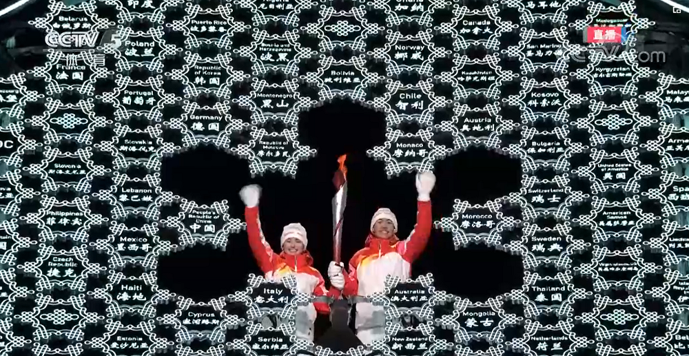 经过多位国家队运动员轮番传递,越野滑雪运动员衣拉木江和北欧两项运动员赵嘉文一起,将最后一棒火炬插在大雪花火炬台的中心。