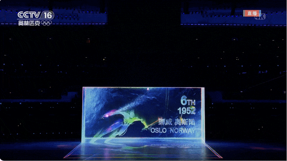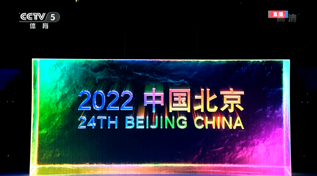 最后显示的是北京冬奥会的名字,这时出现6位冰球运动员,他们挥动冰球杆将虚拟冰球击向冰立方。