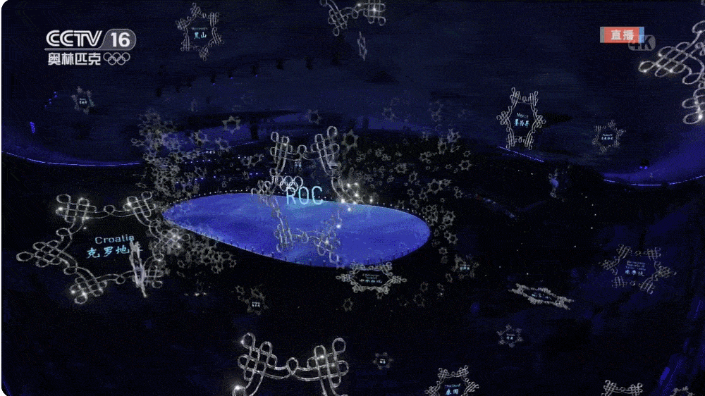 每个国家或地区的代表队入场时都有一个雪花形状的引导牌,在中国代表队入场后,引导员手拿雪花引导牌汇聚在一起,此时虚拟的雪花也开始显现。