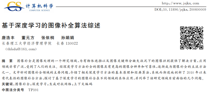 摘要: 图像补全是图像处理的一个研究领域,为有物体遮挡以及图像关键部分缺失状况下的图像识别提供了解决方案,应用领域非常广泛,受到了人们的关注。经深度学习方法补全的图像具有更高的图像分辨率和可靠性,逐渐成为图像补全的主流方法之一。文中针对图像补全领域的主要问题,介绍了相关深度学习方法的基本原理和经典算法,系统而渐进地剖析了2010年以来有代表性的图像补全方法,探讨了基于深度学习的图像补全在不同领域的具体应用,并列举了该研究领域目前面临的几个问题。