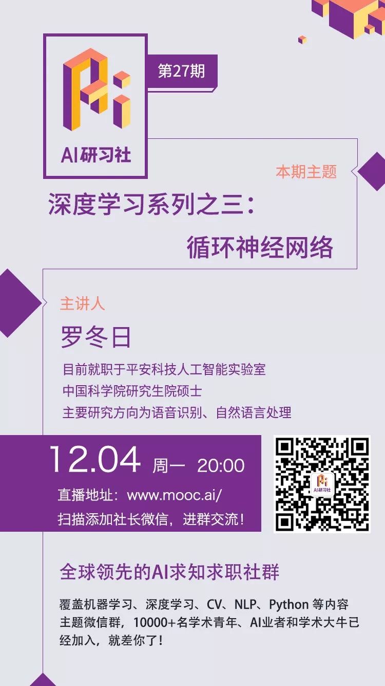 人工智能兴起的环境下,采用深度学习来进行图像识别、语音识别的效果越来越好,并且基于深度学习的算法也在慢慢应用到各行各业中去,深度学习算法也正在快速普及。本场公开课嘉宾将重点介绍卷积神经网络。本系列公开课一共三场,本场为第三场,将重点阐述循环神经网络。