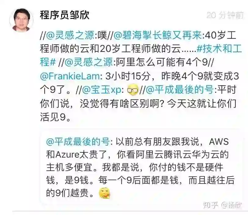 就这次事件来说,有人说公有云就是不行,还是私有云牛逼,能达到多少个 9。